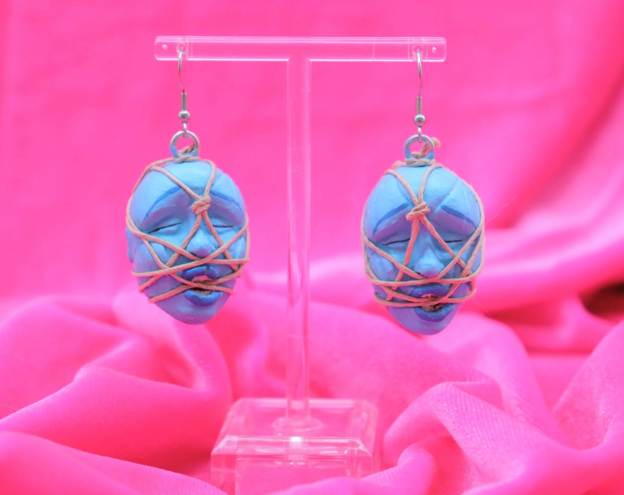 These heads were originally sculpted based on rope art created by AKA Sapphic Perv . They were then made into a mold, cast in resin, painted with gouache and then Line ties the tiny ropes. The earring hooks are stainless steel.